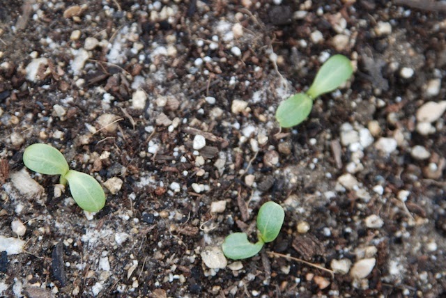 | 真ん中下に見える芽は、出てきた葉の一部が虫にかじられている。 時にこんな予想外の出来事は起こる。 |