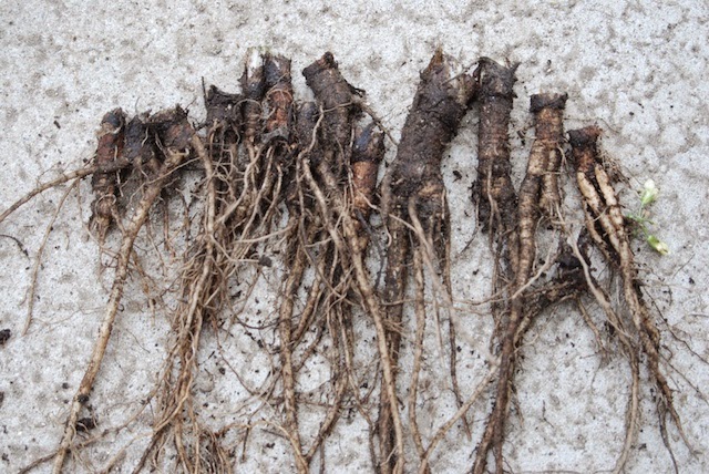 | 収穫したゴボウは見るも憐れな短小ゴボウ。 それでも味見程度はしてみたいと、これらのゴボウを持ち帰った。 |