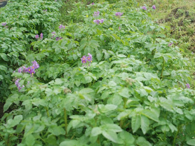 | 遅植えのデストロイヤーも、もう花を付け、1ヶ月後くらいには収穫が始まりそうだ。 1月終わり頃植えた第1陣は茎葉の茶変が始まっているので今月中には収穫だろう。 |