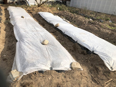 | この畝の不織布はやや厚めなので1枚を被せている。 去年使ったものの使い回しだ。 |