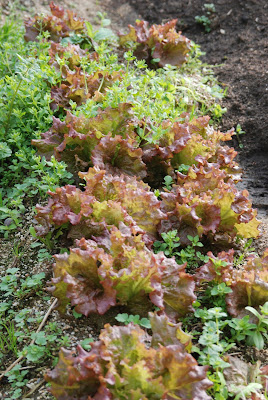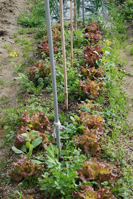 | 雑草も伸びたがサニーレタスも大きくなった。 種から育てた野菜としては立派なものだ。 |
