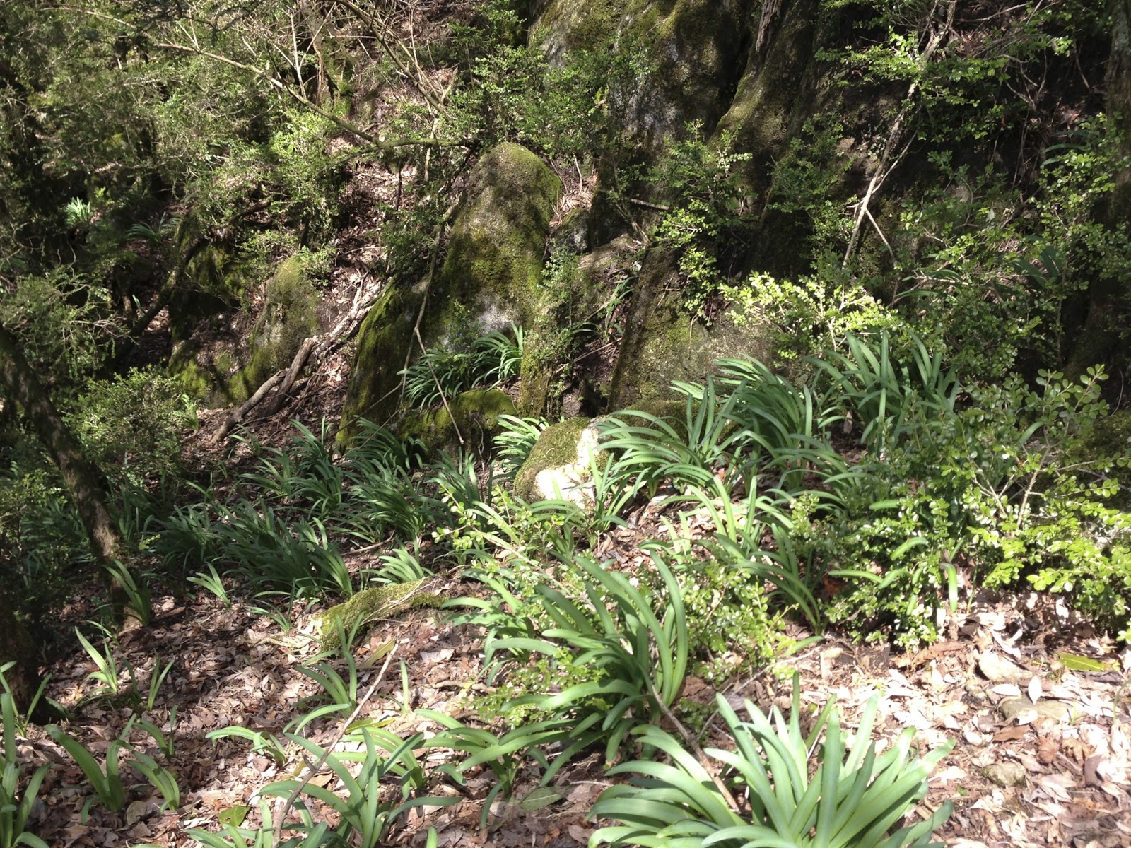 | オオキツネノカミソリの新しい葉も群生して顔を出していた。 福岡市西方の井原山にはかなわないが、 今見えている葉が枯れたあと7月の終わりには一斉にオレンジ色の花を咲かせる。 |