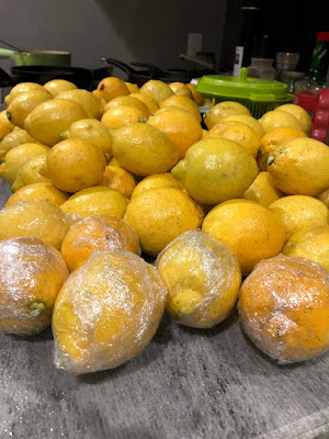 | 手前のラップをかけているのは、冷凍用。 他のレモンも汚れを少し落として、お裾分けを待っている。 |