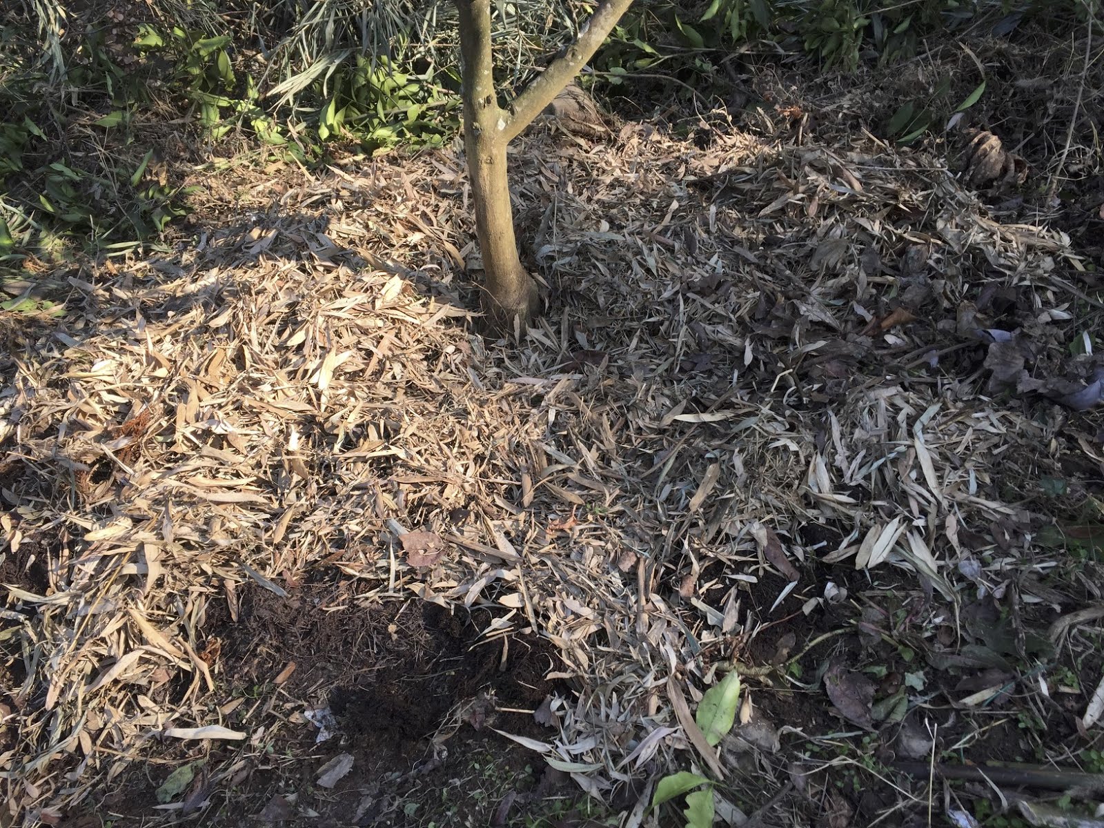 さらに、幹の周りを片付け枯れた松葉や竹の枯葉で厚めにマルチをした。