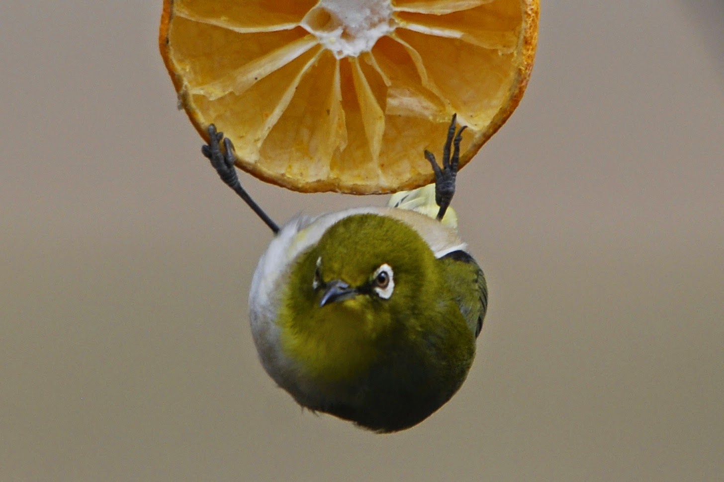 | ミカンにぶら下がっているのに顔は180度回転している。 へ〜こんな曲芸も出来るんだ。 |