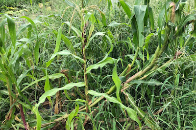 | 私はこの高さになった7月の苗を見て感激していたが、食べたトウモロコシの評判が悪すぎた。 来年からは、この背が高くなる苗は二度と目にすることがないかもしれない。 |