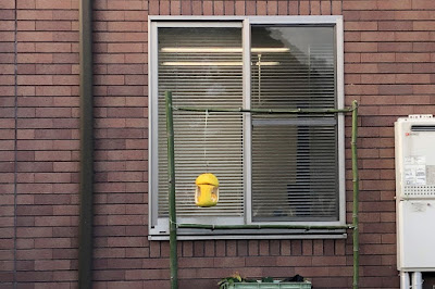 | こちらは仕事場の中から第1菜園を覗ける窓。 そのすぐ側に、メジロ君の家第1号をぶら下げた。 |