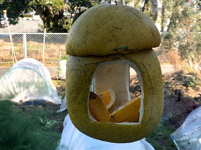 また、メジロ君の家だけでは、メジロ君がミカンの存在に気づかない可能性があるので、第1菜園のところどころの竹支柱にミカンを載せた。