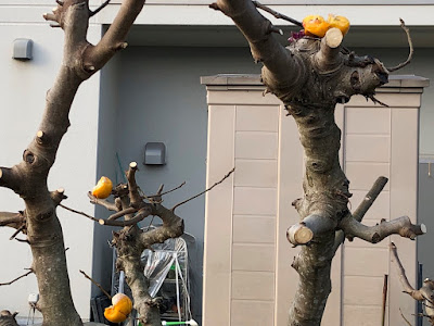 さらに、こちらはヒヨドリもやってくる可能性が高いのだが、例年のようにイチジクの枝にもミカンを刺しておいた。