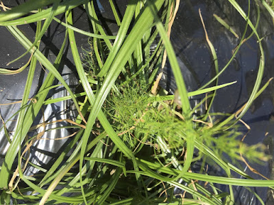 | よく見ると何とかアスパラの苗は生き延びているが、どう見てもピンチだ。 “ハマスゲ”は“カヤグサ”よりはるかにタチが悪い。 その根茎がスギナのごとく力強いのだ。 |