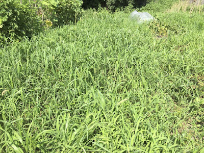 | 強いサツマイモの苗だが、日が当たらなくなるとさすがに弱ってしまいそうだ。 ここの雑草は、ほとんどが“カヤグサ”の仲間のようだ。 |