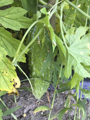 | 雑草片付けのご褒美で、3個の収穫できた。 ゴーヤはしばらくは、必要十分量が収穫できそうな感じだ。 |
