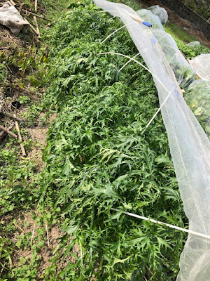 | まだたけに蔓を伸ばしているものは少ないが、こちらも問題なさそう。 外側には風予防の竹の枝葉が置いてある。 |