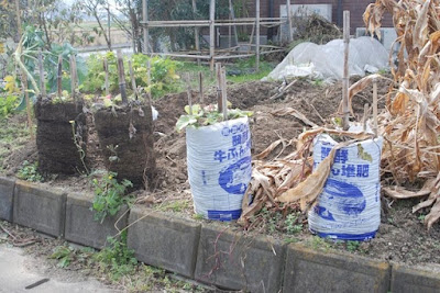 | 今年のゴボウ栽培は、堆肥袋として使われるビニール袋を切り抜いて使った。 |