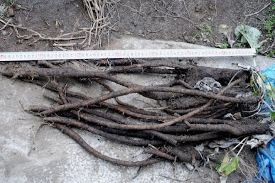 | 最長が69cm、64〜5cmのものが5本程あった。 狭い袋の中でのゴボウ栽培としては上等だろう。 |