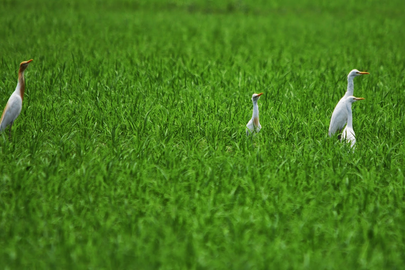 この時期になると緑がきれいになった田んぼには、親鳥たちに混じって多くの子供のサギが遊びにくるようになった。