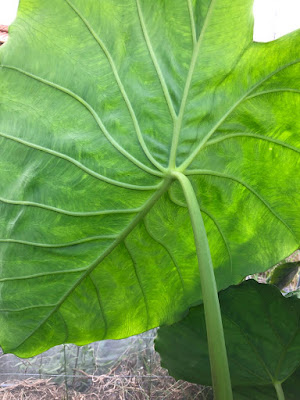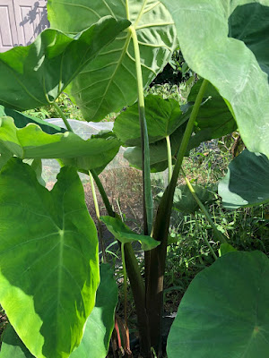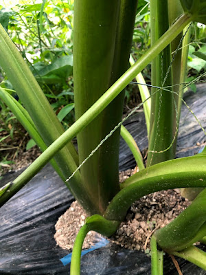 | 『黒軸』と『赤芽大吉』が全く同じ1m30cmほどに育っている。 今年は久しぶりに10cm以上の親芋を残せるかもしれない。 |