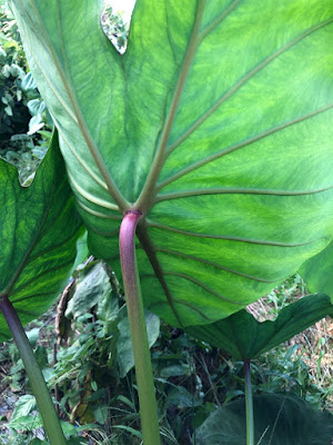 | 『黒軸』と『赤芽大吉』が全く同じ1m30cmほどに育っている。 今年は久しぶりに10cm以上の親芋を残せるかもしれない。 |