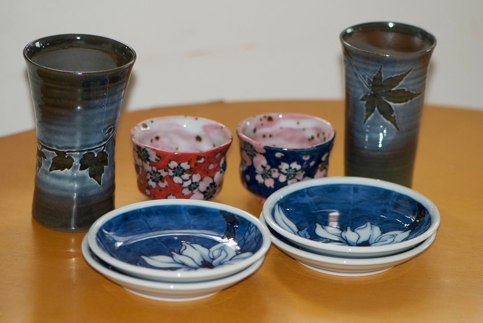 | 買ってきたのは、大きめのぐい飲みとビールグラスと酒の肴を載せる小皿。 手前の皿は有田焼き、奥は日田焼き(両端)と波佐見焼き(中央)。 |
