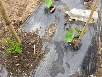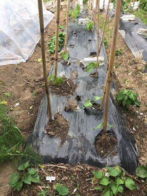 | それでも、まだ支柱がない箇所は残っている。 そんな場所には別の野菜苗でも植えてみよう。 |
