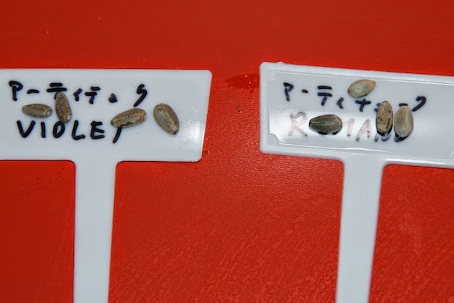 | アーティチョークの種は初めて見た。 ヒマワリの種を半分にしたような感じだ。 VIOLETとROMANOという2種類がある。 |