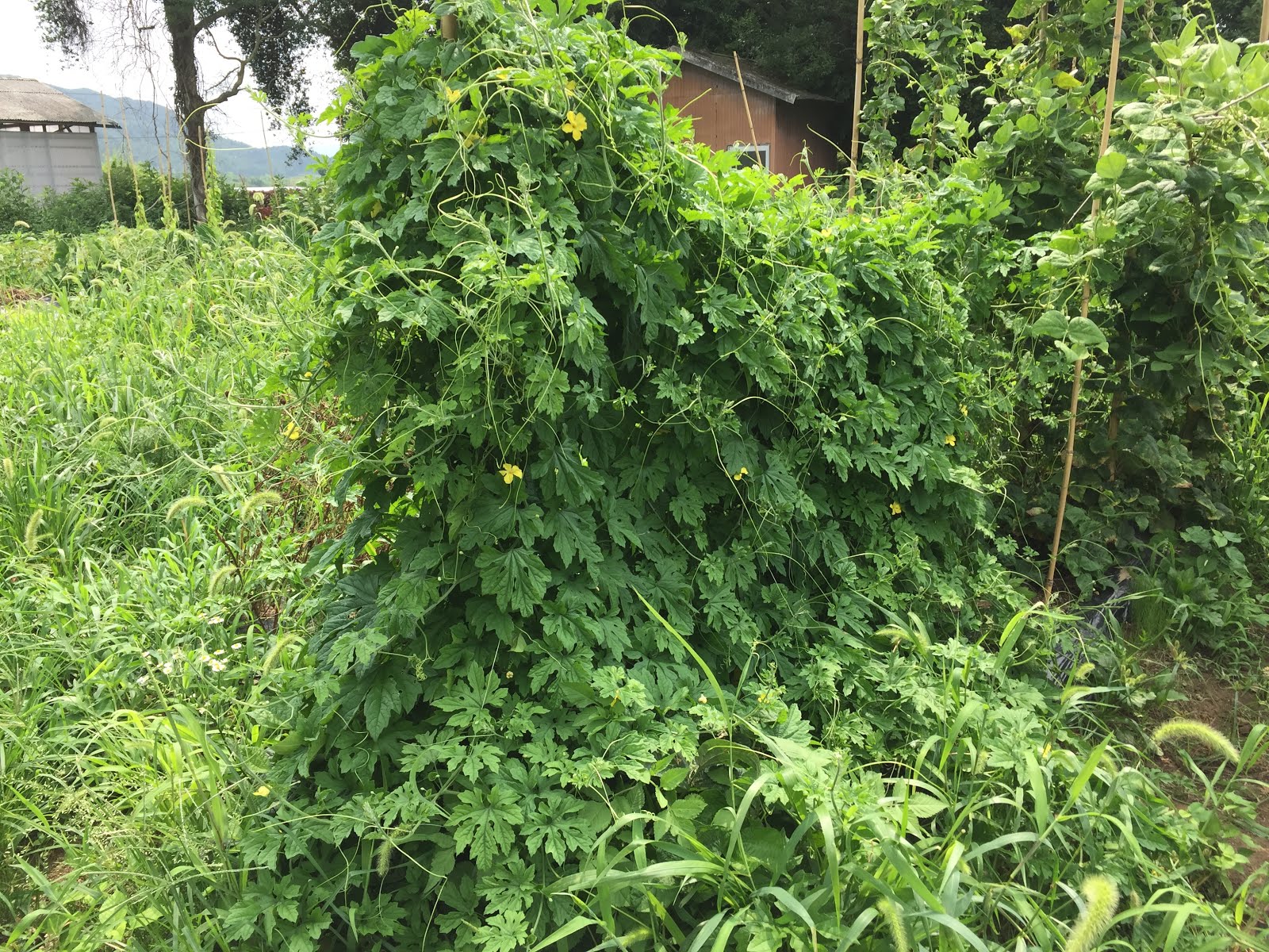 第2菜園に2列蔓野菜用の畝を作り、それぞれに数本ずつ育てている。