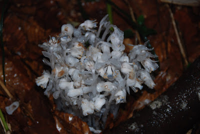 | 霧の中の、人が来ない自然を喜んでいるかのように小さなキノコが密生していた。 |