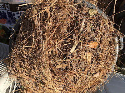 | 松葉のことは、英語でpine needlesとpine strawという二つの表現が使われている。 木に付いている葉はpine needlesが合うし、上の写真のような松葉にはpine strawが合う。 こんな感じの状態でEM1と糖蜜を1Lのお湯で溶かしたものを振りかけた。 |
