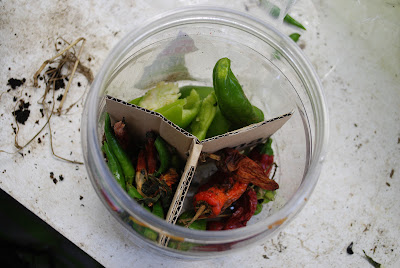 実験設定は11月1日、ピーマン、シシトウ、トウガラシをボリュームが同じようになるように量を調節し、3区画に分けた容器の下の方に入れた。