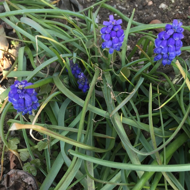 この時期、我が家の花壇にはほとんど花が咲いていないのだが、小さなムスカリが咲き始めた。