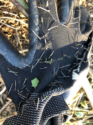 そんな、仕事な後は手袋や衣服や帽子にコセンダングサの種がたくさんくっつき、後処理が大変だ。