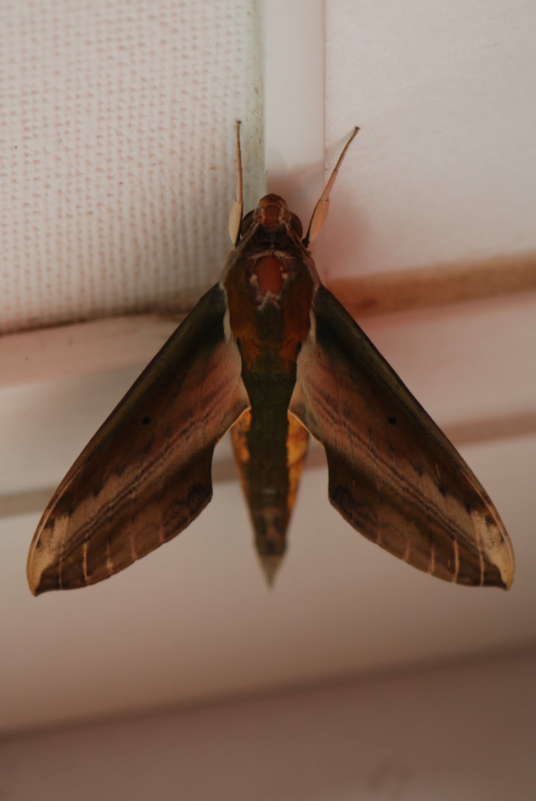 どこから入ったのかわからないが、部屋に居たスズメガの頭部を上から見たところだ。