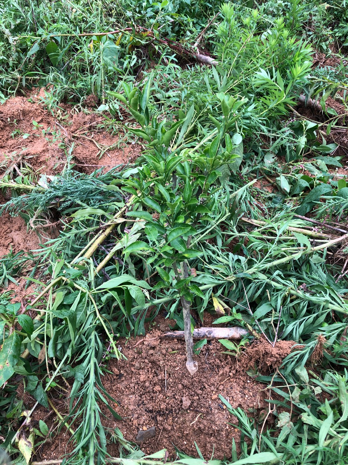 周りをイノシシに掘り起こされていたジャバラの苗木の周りには引く抜いた雑草を置いておいた。