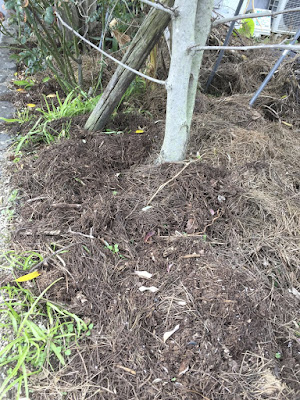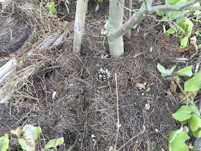 で、、ビニール袋から散乱した松葉を集め、袋に残った全てを取り出し、またポリバケツの松葉も全て取り出し、菜園側のオリーブなどの木の根元や花壇に撒いてマルチングした。