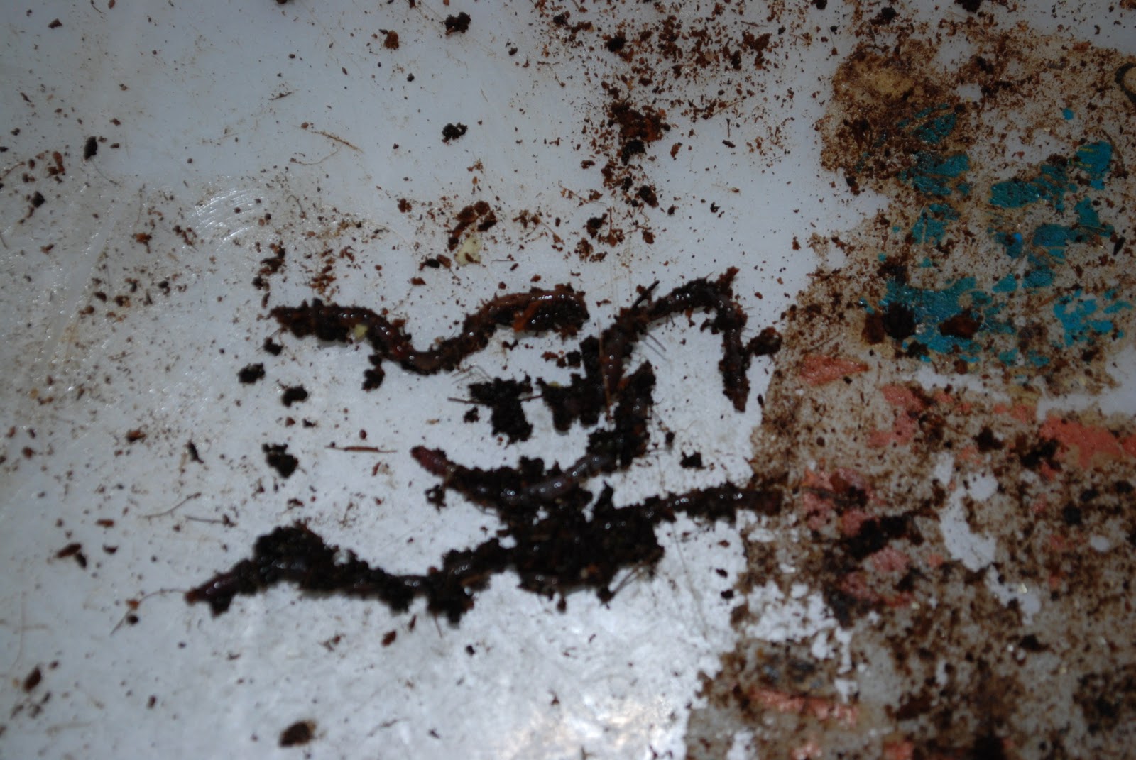 | 討ち死したみみず、これらはすべて温州みかんの皮の中に身を投じた勇敢な戦士です。全く動いていませんがまだ蘇生する可能性ありそうなので十分水で洗ってよい環境の中に戻しておきました |