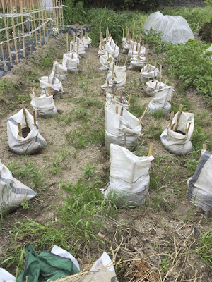 | 背が低い土嚢袋に、今日サツマイモの苗を移植した。 背が高いビニール袋にはゴボウの苗が育っている。 |