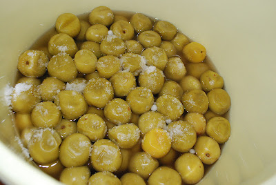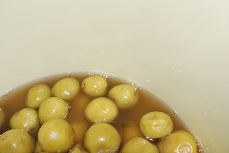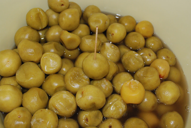 樽をローリングさせると同じような膨らんだ梅が浮かんできて、爪楊枝で穴をあけたところから泡(発酵ガス)がでている。膨らんだ梅をそのまま漬けると梅が硬くなって美味しくないとのことだ。可能な限り同様の梅に爪楊枝で穴をあけガス抜きを図り