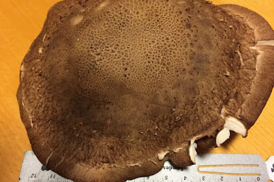 | 翌年の晩秋には傘が開いて形は悪いが15cm近い大きな椎茸を収穫することが出来た。 |