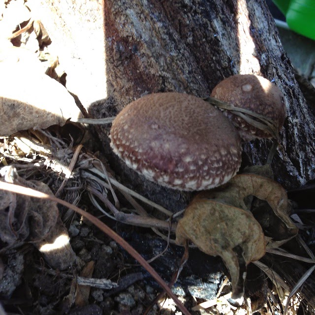 日陰がいいとの事で生い茂ったイチジクの木の下がよかろうと、そこにほだ木を立てかけた。