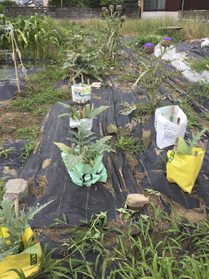 というように、花を咲かせたものも含め、多くのアーティチョークを育てている畝を眺めたのが下の写真。