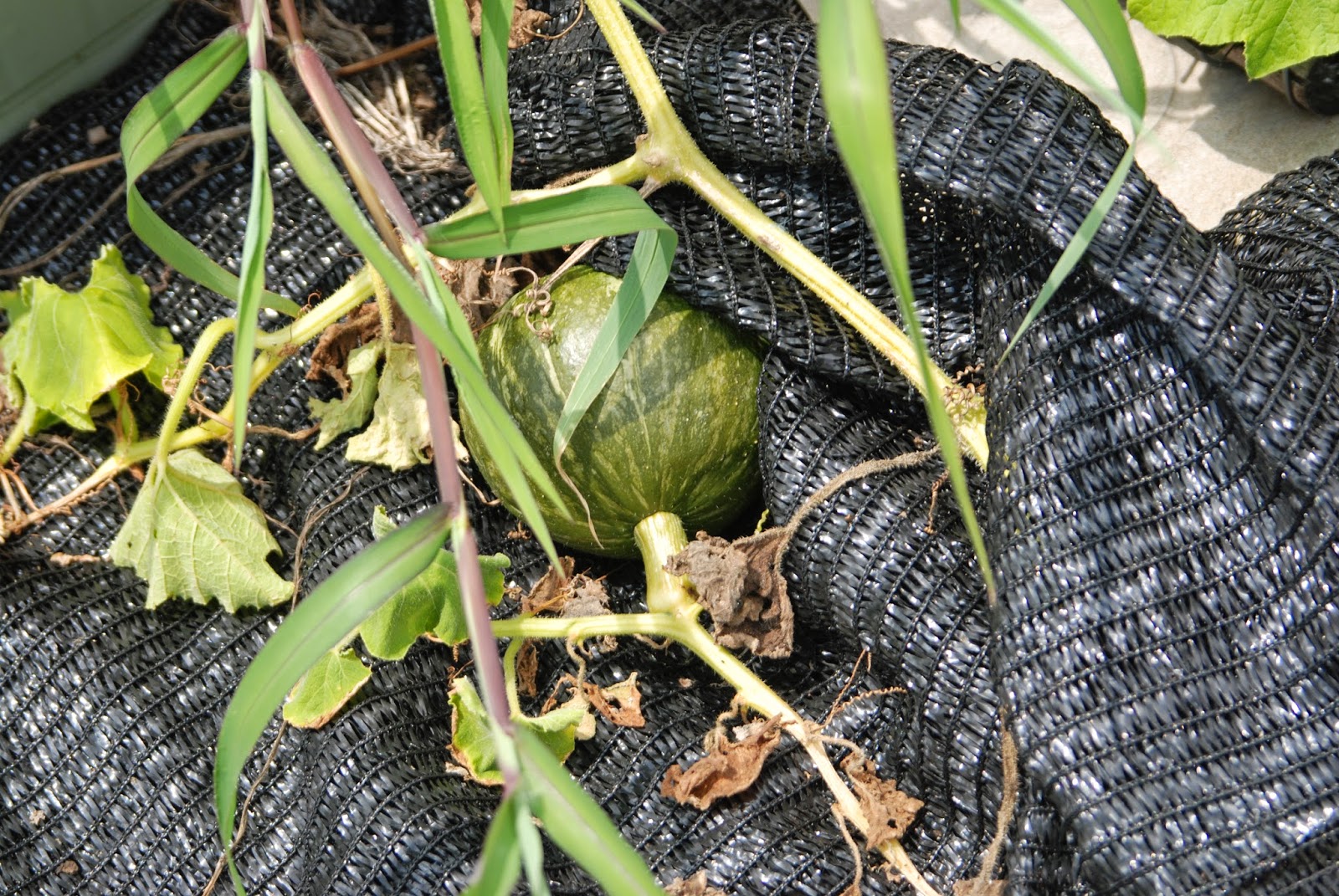 6月の終わりから7月にかけて遮光ネットの上をカボチャの蔓が元気よく伸びていた。