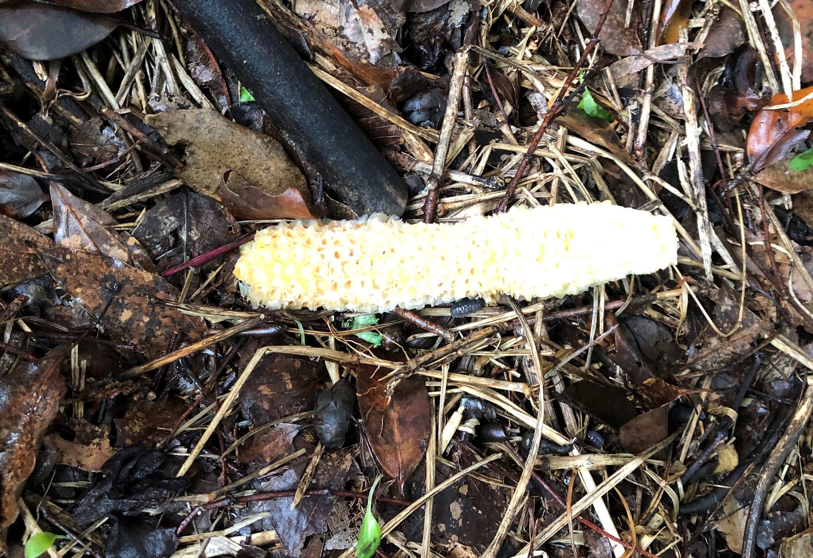 | 恐らくこのな木の上にトウモロコシを運んで食べたのだろう。 |