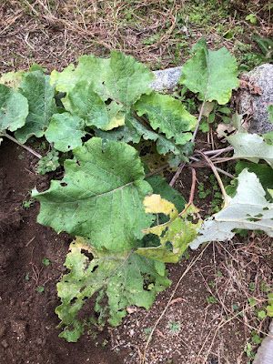 | このゴボウは育った場所が少しずれていたみたい。 とても根を掘り起こす気にはならないので、来年の種取りに回そう。 |