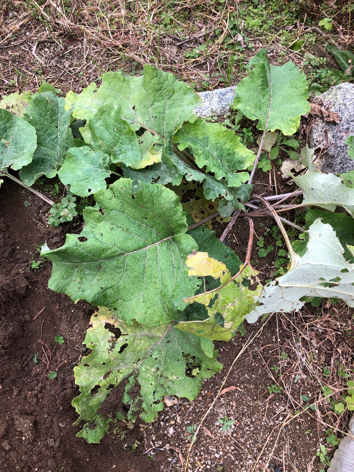 | このゴボウは育った場所が少しずれていたみたい。 とても根を掘り起こす気にはならないので、来年の種取りに回そう。 |