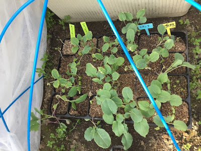 これらのポットには、ブロッコリー、茎ブロッコリー、スペインキャベツが育っている。
