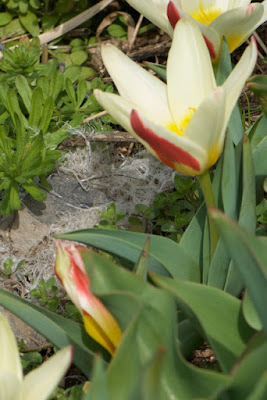 チューリップで最初に咲いたのは赤い花弁がアクセントの小さな花。