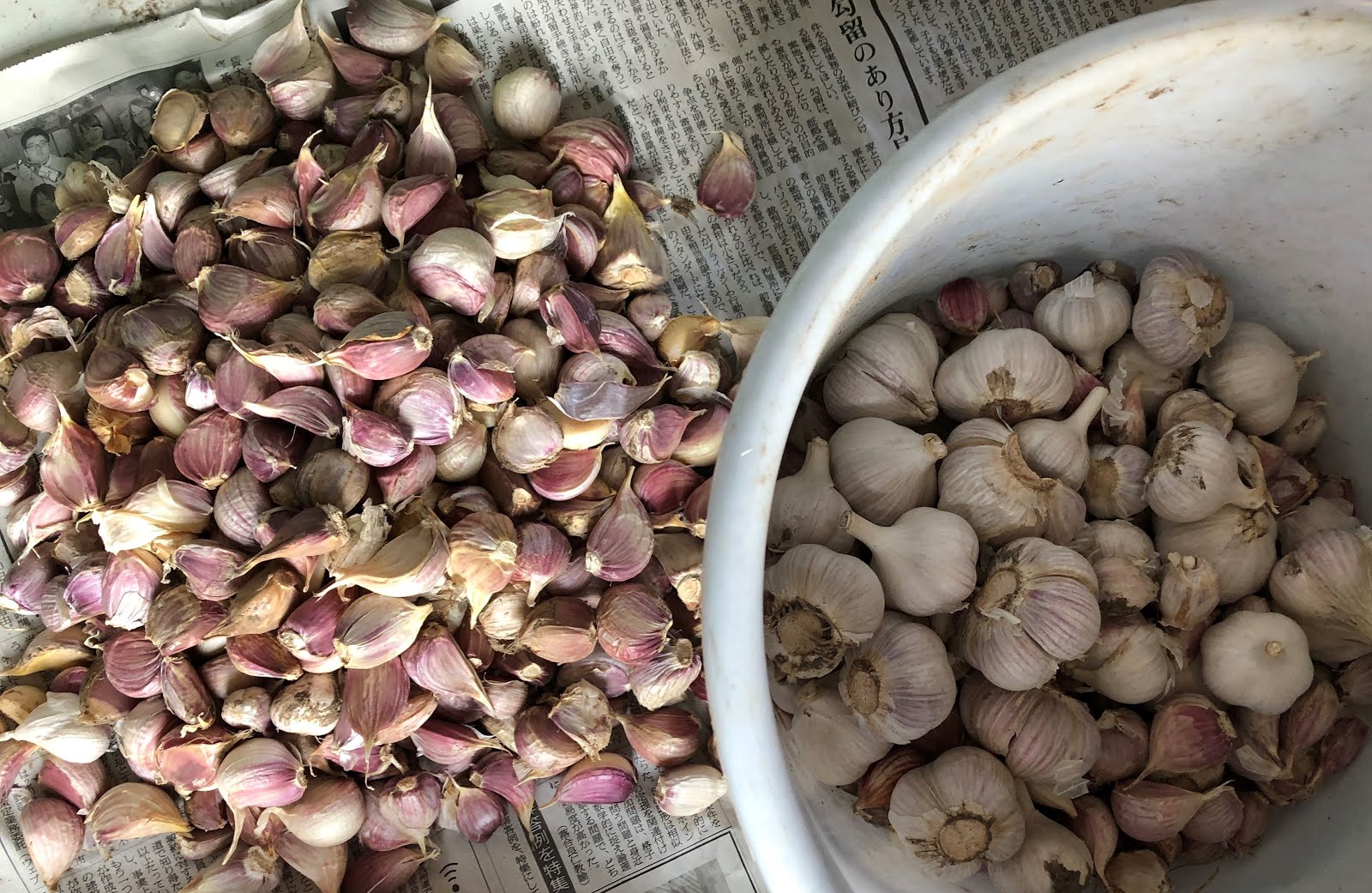 | 一見きれいなのだが、うまく分球できなかったニンニク。 こんなニンニクは長期保存できそうにない。 |
