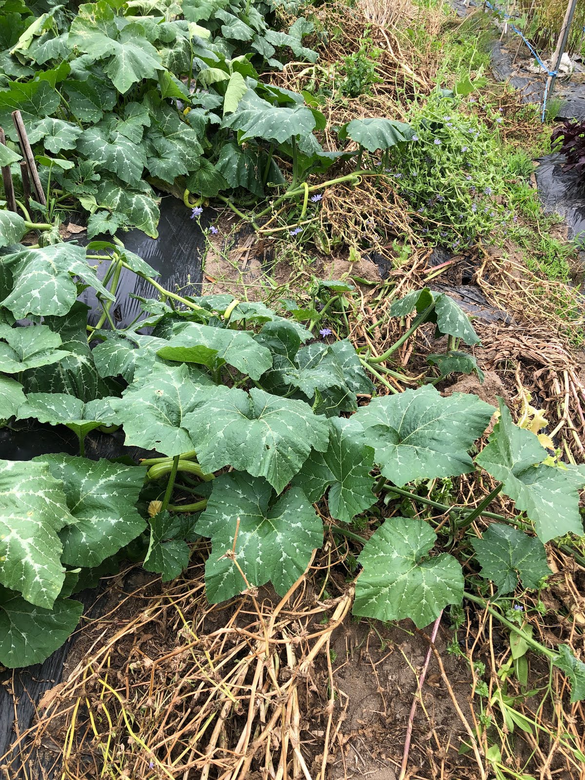 このズッキーニは、通常のズッキーニとカボチャの間の性格を持っているみたいで、実も長くなるが蔓もカボチャのように地を這って長く成長する。