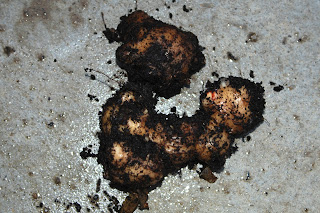 | 右に見える種芋は、牛糞堆肥に入っていたものとほぼ同じだ。収穫できた芋は全て種芋より小さい。 とれた芋のサイズは、やはり茎の太さや葉の茂りに比例していたようだ。 |
