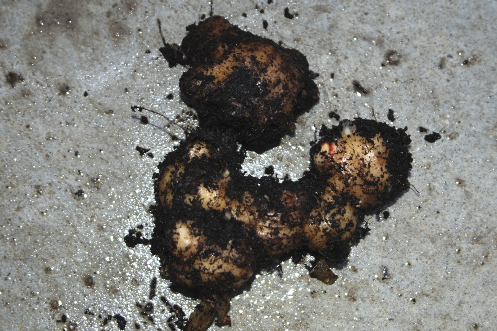 | 右に見える種芋は、牛糞堆肥に入っていたものとほぼ同じだ。収穫できた芋は全て種芋より小さい。 とれた芋のサイズは、やはり茎の太さや葉の茂りに比例していたようだ。 |